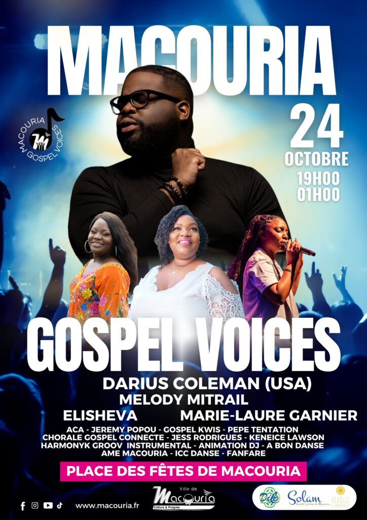 Préparez-vous pour une soirée mémorable le 24 octobre 2025 à Macouria ! Rejoignez-nous pour Macouria Gospel Voices avec Darius Coleman (USA), Melody Mitrail, Elishéva, Marie-Laure…
